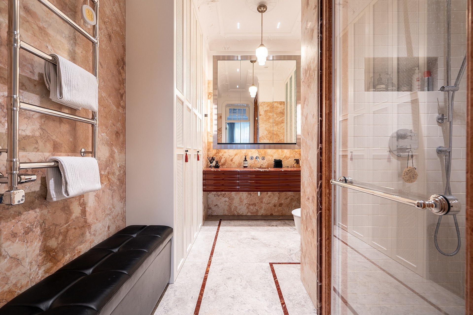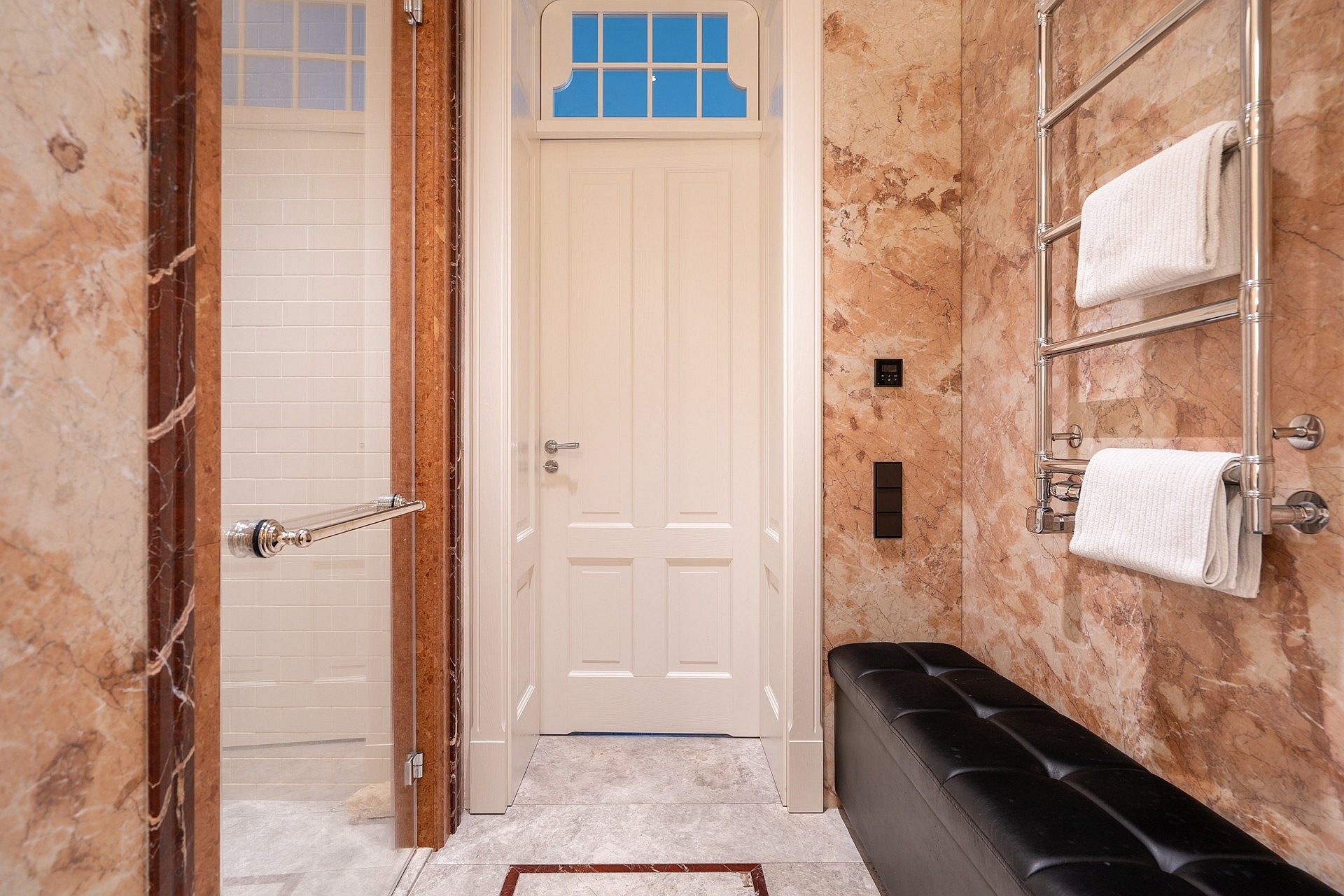 Hoofdslaapkamer met tweepersoonsbed en eigen badkamer. De tweede badkamer met ruime douche is toegankelijk vanaf de hal.