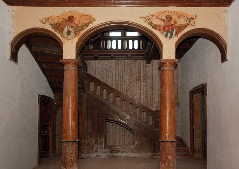 In het gebouw zijn veel originele elementen bewaard gebleven, die kenmerkend zijn voor de Art Nouveau-stijl: Het hoogtepunt is de open houten trap met prachtig versierde zuilen in de inkomhal. Verder zijn er decoratieve plafondbetimmeringen, deuren, panelen en ijzeren beslag te zien. De daken zijn gemaakt van gewone dakpannen, de koepels van de torens en hun kruisbloempjes zijn van koper.