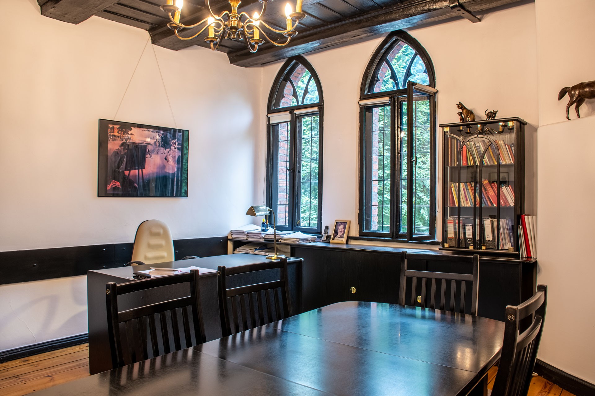 Op de bovenverdiepingen zijn er verschillende kantoren en kleinere opslagruimten. De kantoorkamers hebben verschillende oppervlaktes: van 13 m² tot 33 m². Alle kamers zijn zeer licht, elegant ingericht en hebben een unieke sfeer met originele antieke elementen.