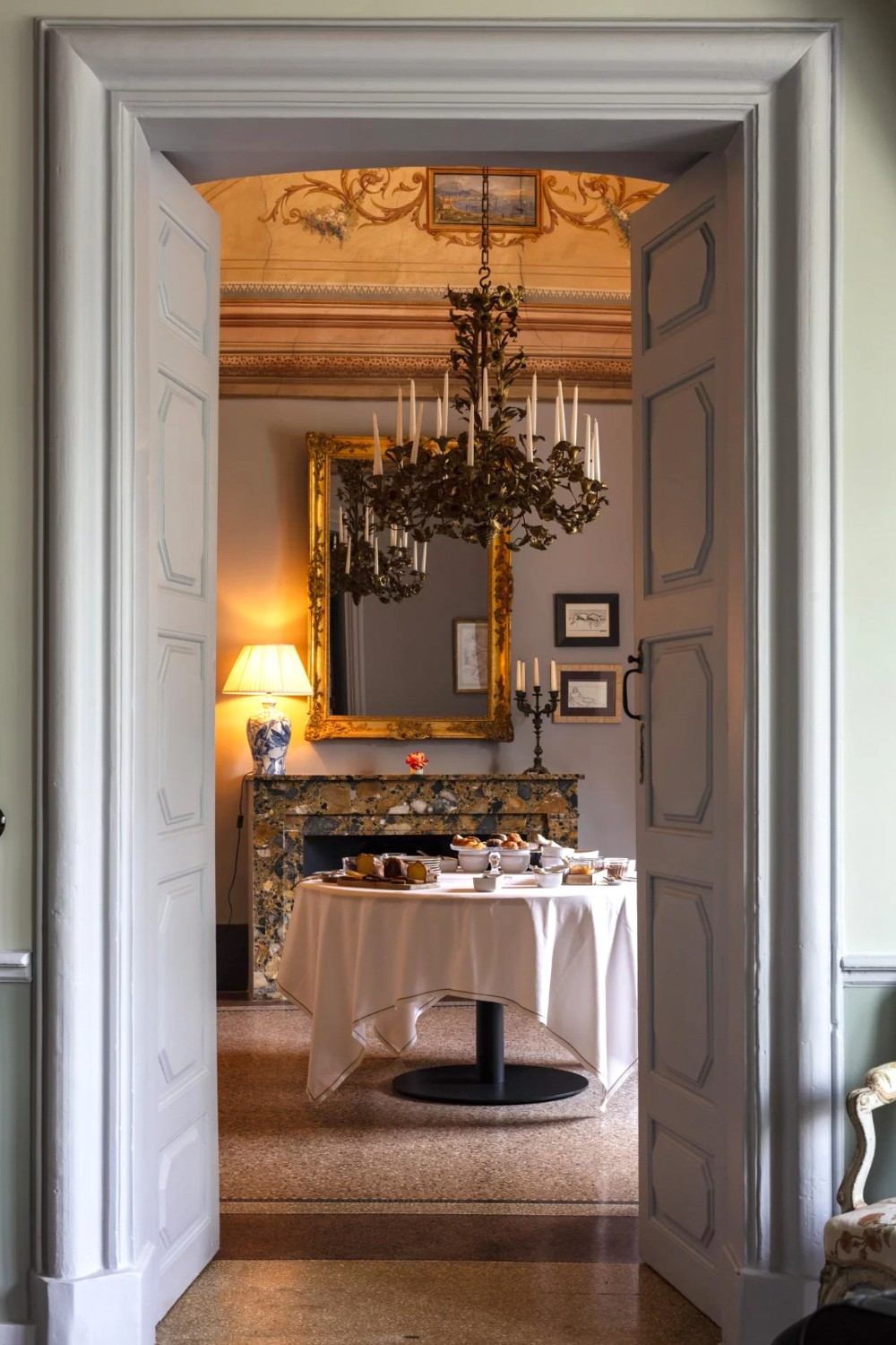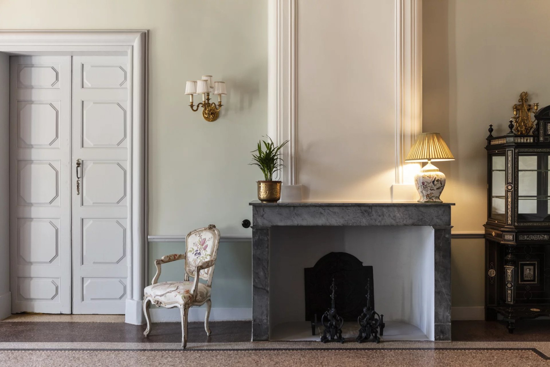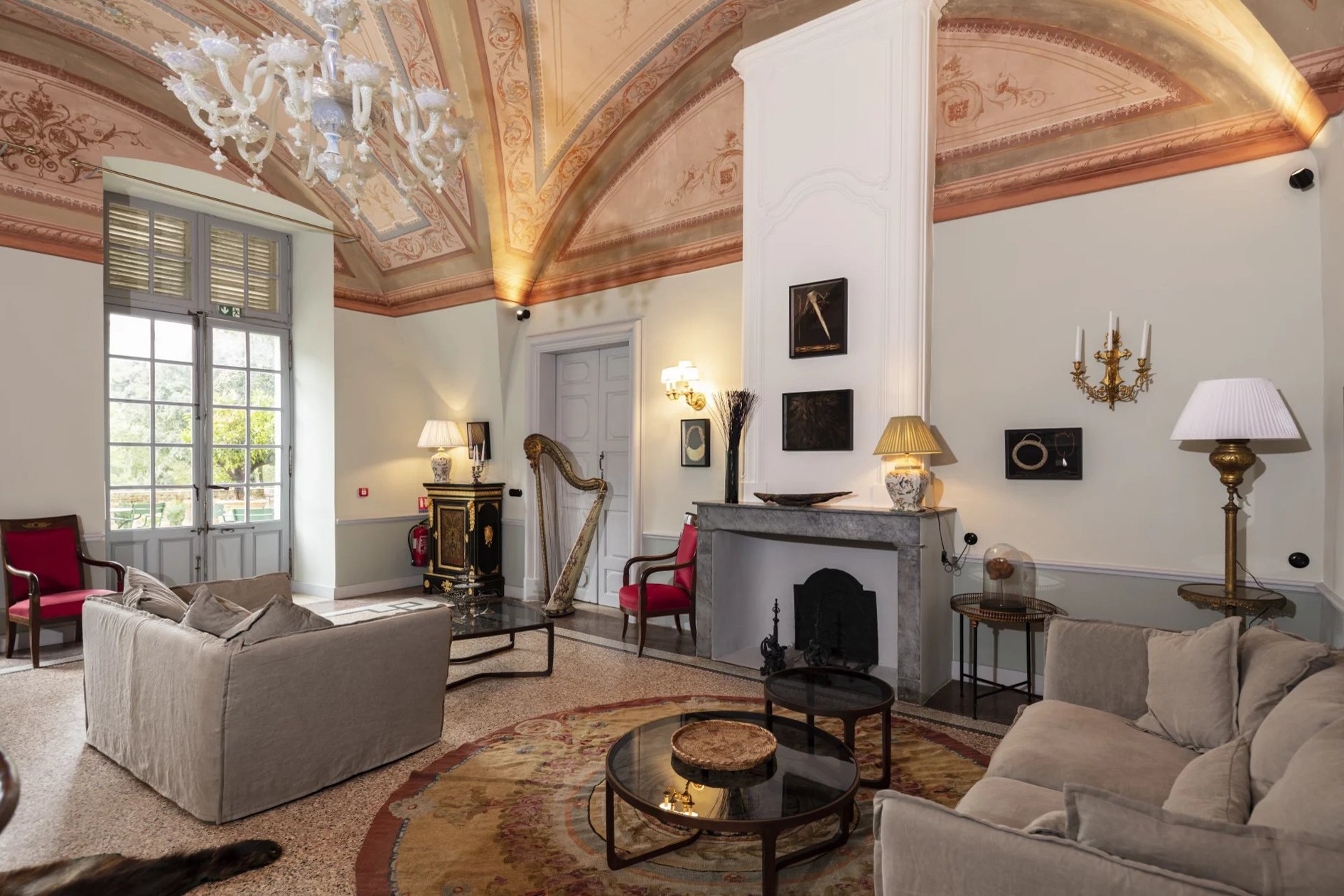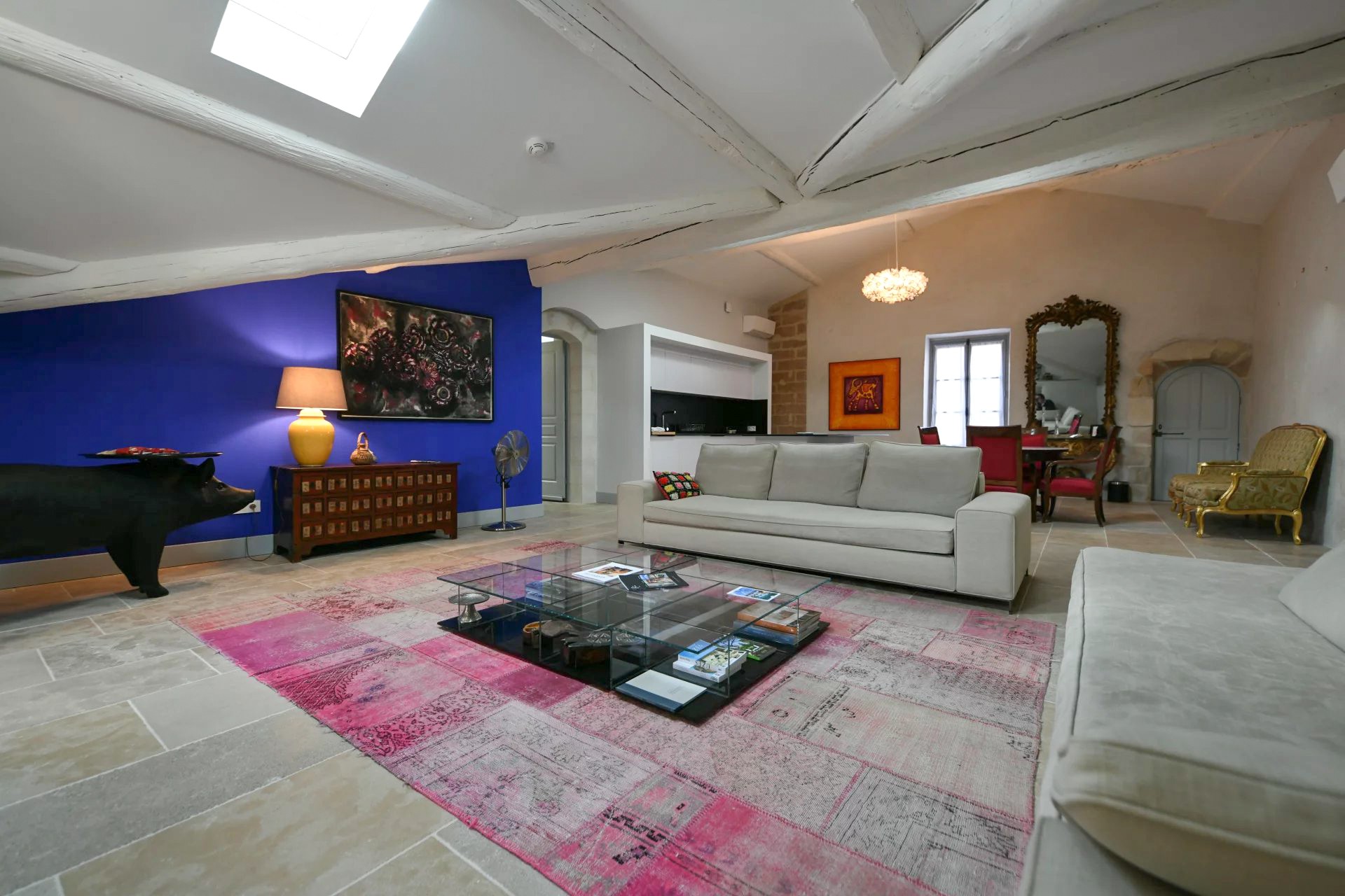 De ontvangstruimtes van meer dan 350 m² openen zich naar een terras met uitzicht op het park en de binnenplaats. Spitsbogen met duidelijke ribben en deurstijlen van gehouwen steen getuigen van de ouderdom van het huis.