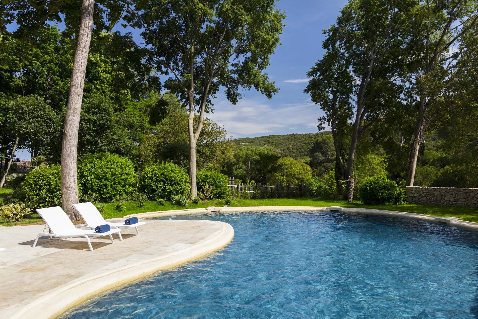 Het park van 1,7 hectare varieert tussen inheemse bomen, garrigue en gazons met fonteinen. Het zwembad ligt tussen het château en de Gardon, met poolhouse, salon en zomerbad. Verderop opent het uitzicht zich op de kloven van de Gardon.