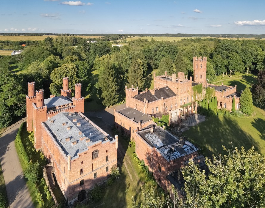 Obecny pałac z parkiem i wozownią (widoczny tutaj po lewej stronie) jest jedną z najokazalszych neogotyckich rezydencji na terenie dzisiejszego województwa warmińsko-mazurskiego. Zbudowany został w 1850 roku przez Juliusa von Mirbach-Sorquitten, właściciela ziemskiego i członka pruskiego parlamentu.