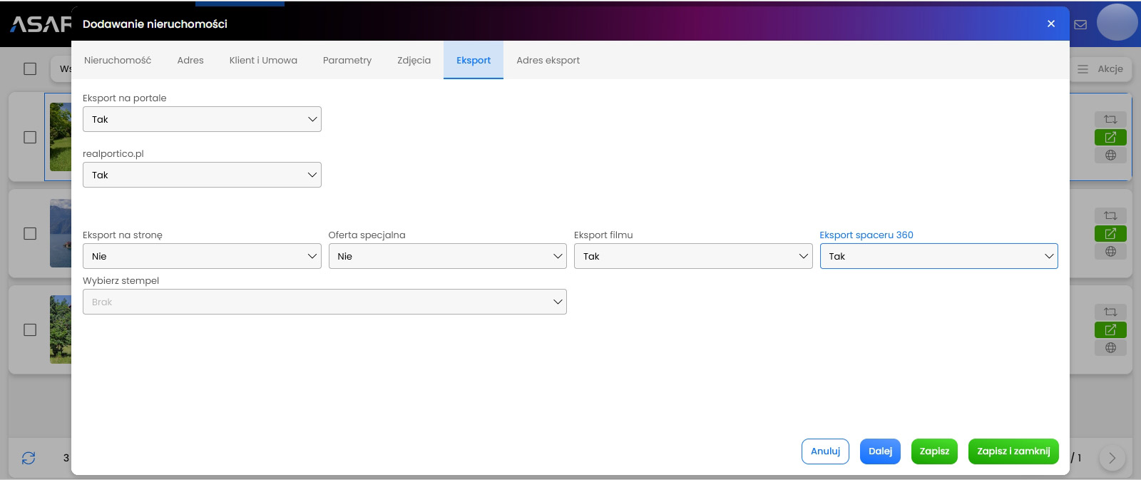 REALPORTICO to niezależny portal, który nie posiada partnerstw ani umów z innymi portalami nieruchomości, portalami ogłoszeniowymi ani systemami CMS, takimi jak ASARI CRM. Dlatego Twoje oferty nieruchomości nie pojawią się automatycznie na naszym portalu, jeśli publikujesz je za pomocą ASARI lub innego oprogramowania. Zamiast tego konieczne jest skonfigurowanie osobnego eksportu i wybranie realportico.pl w opcjach eksportu danej nieruchomości.